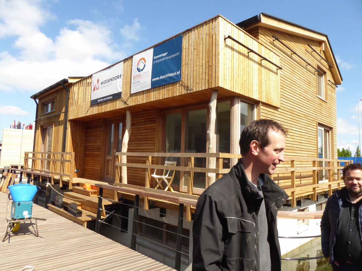 De door ons ontworpen drijvende woning met twee appartementen (ongeveer 2 x 90 m2) is inmiddels aangemeerd op haar plek in het duurzame drijvende wijkje "Schoonschip" in het Johan van Hasseltkanaal in Amsterdam Noord.
